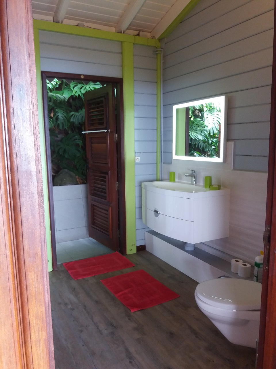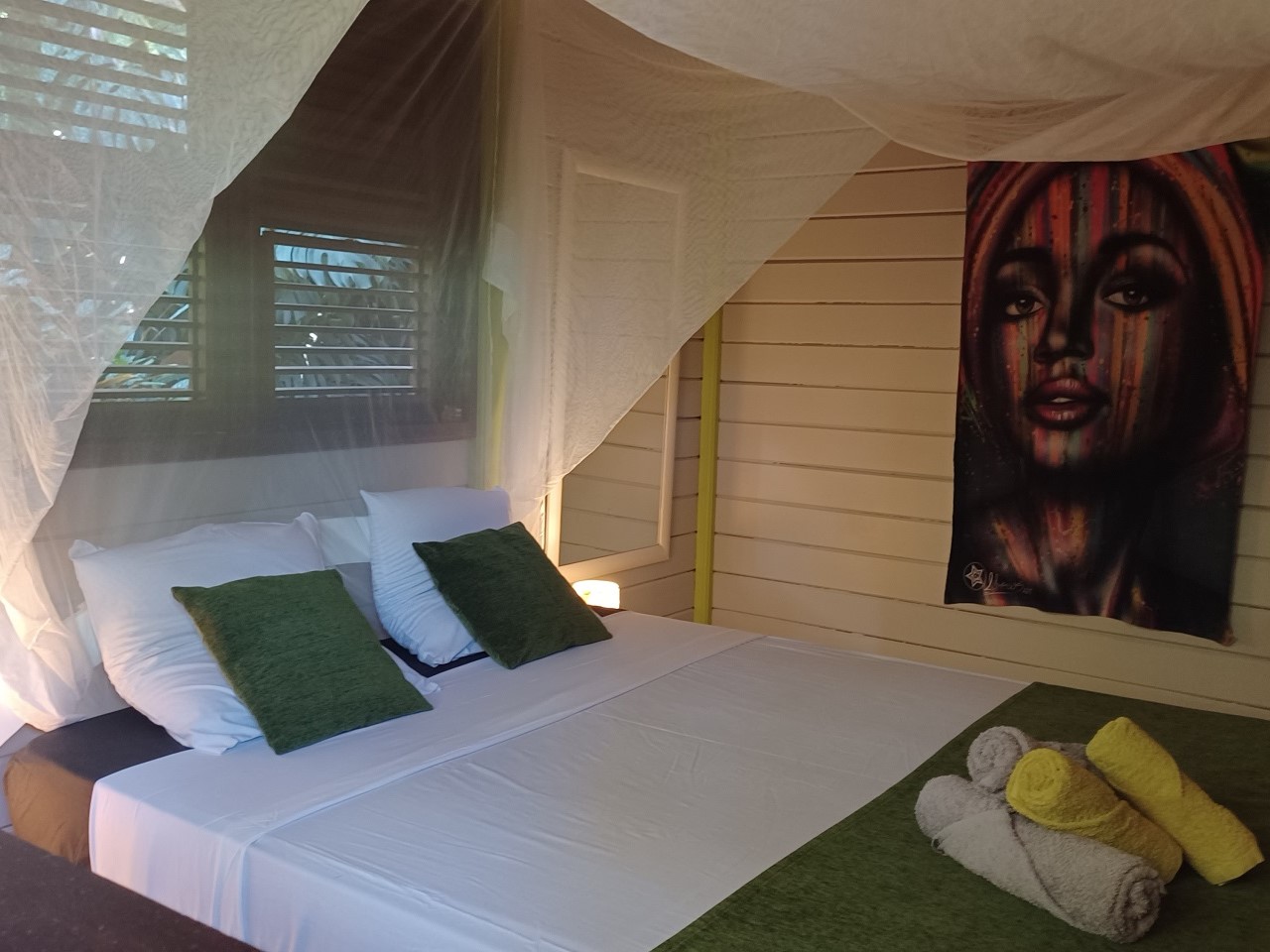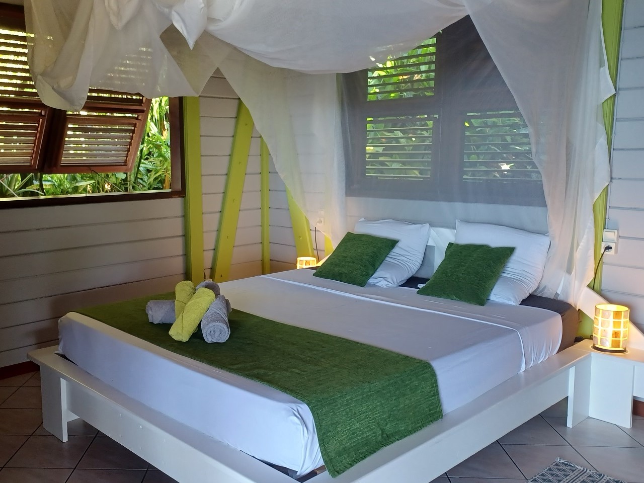 chambre double (literie 160 x 200), Chambre simple (2 lits de 90 x 190), Linge de lit, moustiquaires, brasseur d'air - Salle de bain